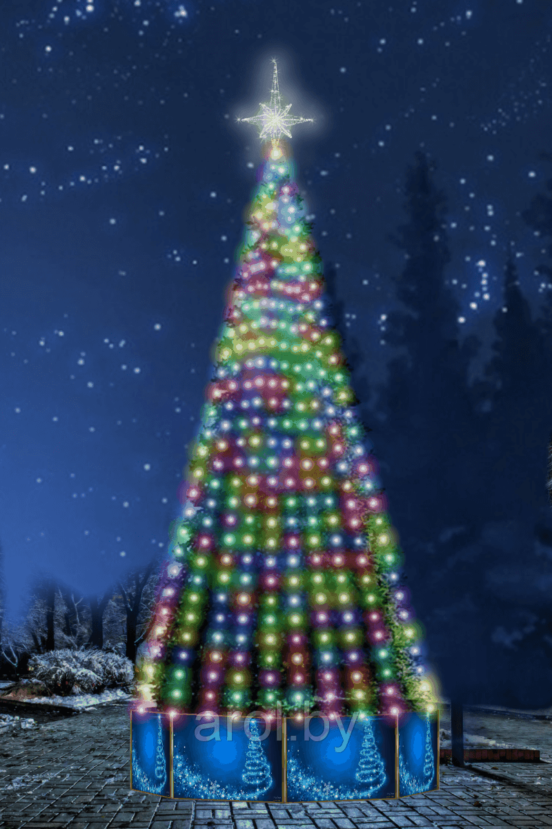 Освещение «ЦВЕТНОЙ КАСКАД» RGB – хаотичная смена цвета каждого диода. Комплект освещения подбирается в зависимости от размера ели.